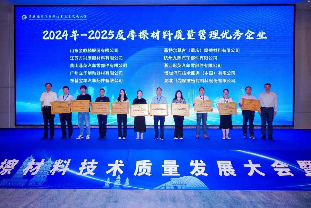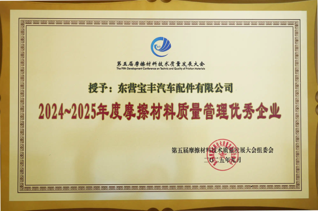 Baofeng Braking has been honored as an Excellent Enterprise in Friction Material Quality Management.